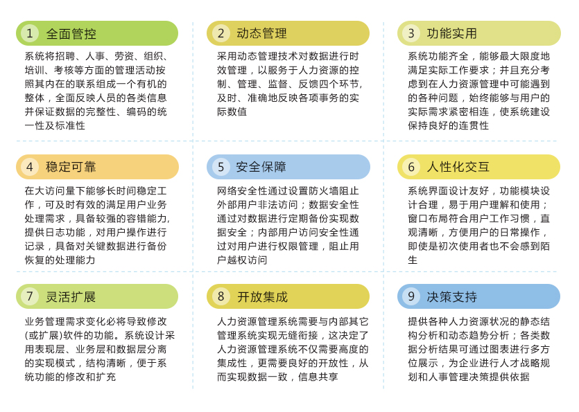 系统以业务信息管理为基础、业务过程控制管理为核心,支持工作流管理、业务流程重组、异构系统集成、 多数据库系统、快速构建业务应用和全面信息共享;并且可以根据用户在发展过程中各种需求变化, 提供及时的技术解决方案,建立符合企业长期发展的整体框架,提升企业长远的人力资本竞争优势。