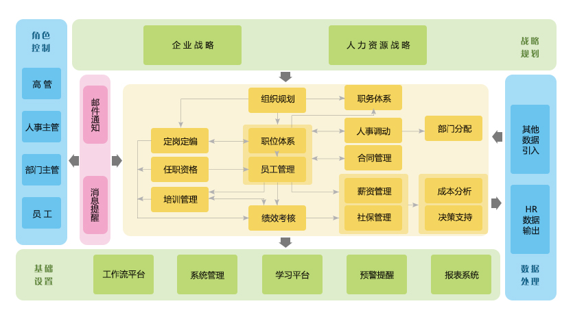 系统能够帮助企业构建现代人力资源管理体系并实现有效落地实施,搭建组织架构、职位体系和员工信息平台, 有效运作薪酬社保、考勤管理、招聘任用等业务体系;并提供系统内数据各种查询统计与报表输出功能, 动态、直观反映组织人力资源状况,为管理行为提供高效决策支持。