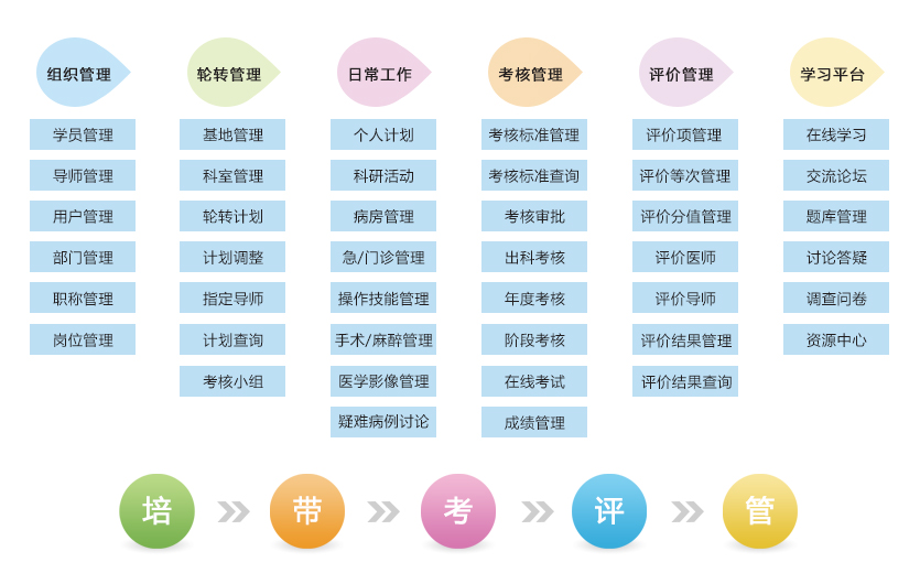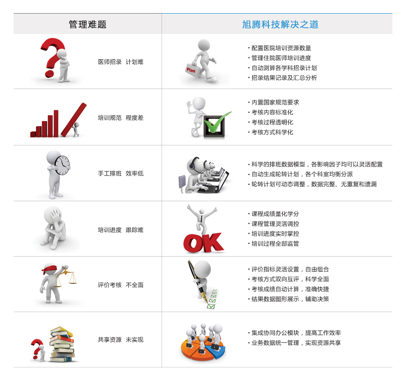 住院医师规范化培训管理平台是旭腾科技根据国家卫生计生委制定的《住院医师规范化培训管理办法(试行)》,结合当前医院培训工作的特点,精心研发而成。系统围绕临床住院医师各项培训工作进行针对性设计,以精细化管理思想为指导,以工作流和信息流技术为核心,以软件为载体和实现手段,采用易于扩展和组装的构件化设计,切实为医院打造住院医师规范化培训管理的综合运营支撑平台。